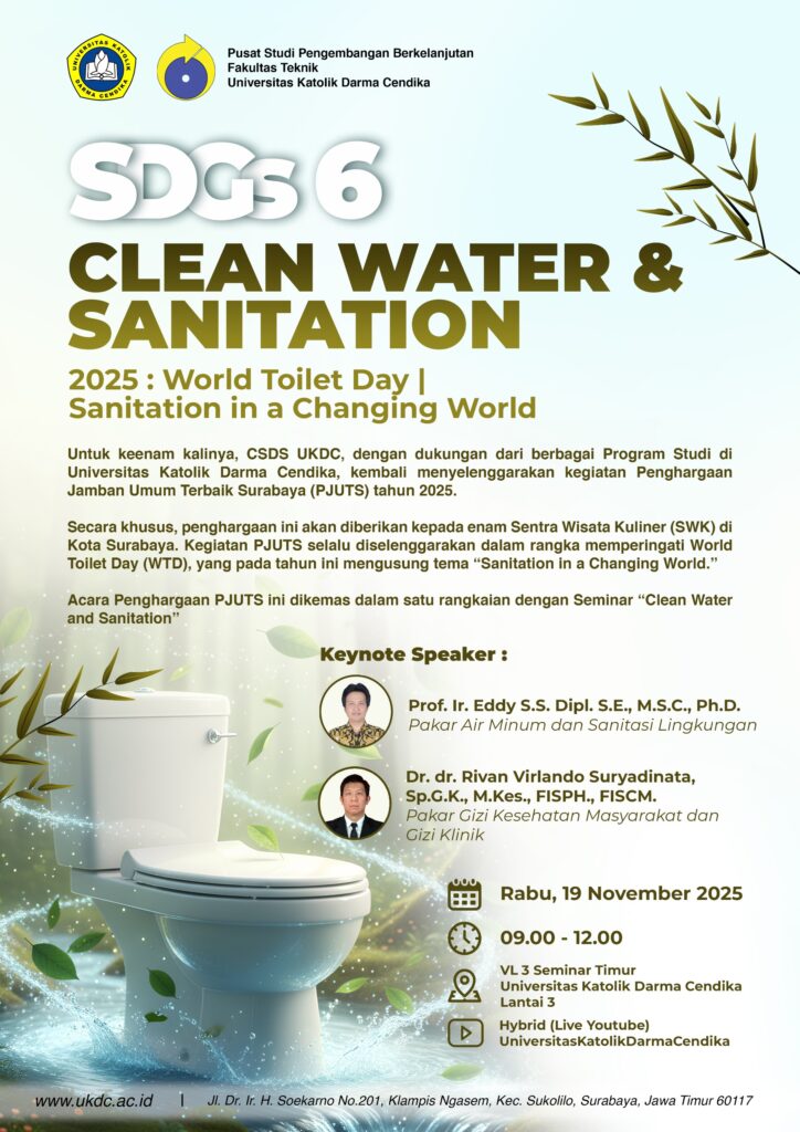 Memperingati Hari Jamban Sedunia pada 19 November 2025 Universitas Katolik Darma Cendika melalui Center for Sustainable Development Studies (CSDS) ikut ambil bagian dalam kampanye air bersih dan sanitasi yang layak (SDGs 6). Kegiatan ini bernama Penghargaan Jamban Umum Terbaik Surabaya, berupaya untuk membanguna kesadaran masyarakat untuk peduli pada air bersih dan sanitasi.